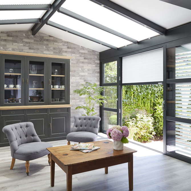Pour une véranda de bureau ou une véranda de chambre, pensez à munir les pans vitrés de rideaux occultants, de volets roulants ou de stores intérieurs pour arrêter les rayons du soleil le cas échéant.